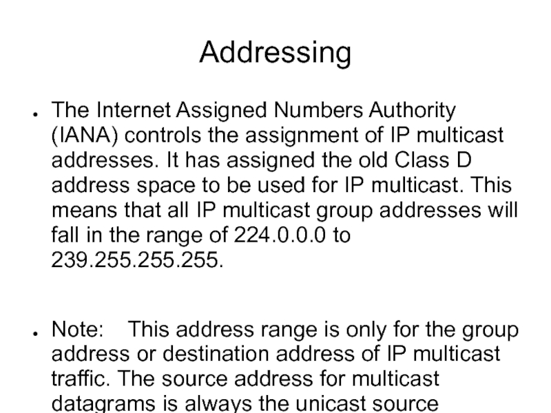 AddressingThe Internet Assigned Numbers Authority (IANA) controls the assignment of IP multicast addresses. It has assigned the