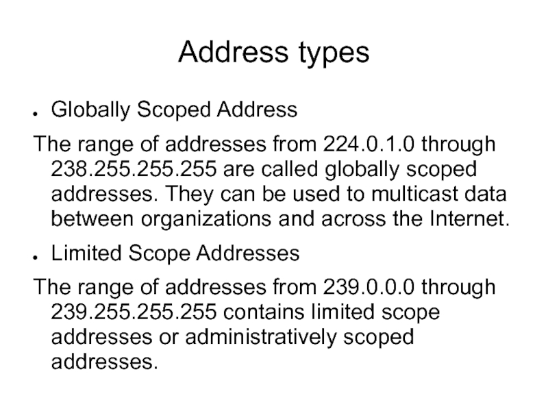 Address typesGlobally Scoped AddressThe range of addresses from 224.0.1.0 through 238.255.255.255 are called globally scoped addresses. They