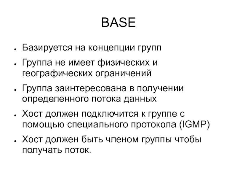 BASEБазируется на концепции группГруппа не имеет физических и географических ограниченийГруппа заинтересована в получении определенного потока данныхХост должен подключится к группе с помощью специального протокола (IGMP)Хост должен быть членом группы чтобы получать