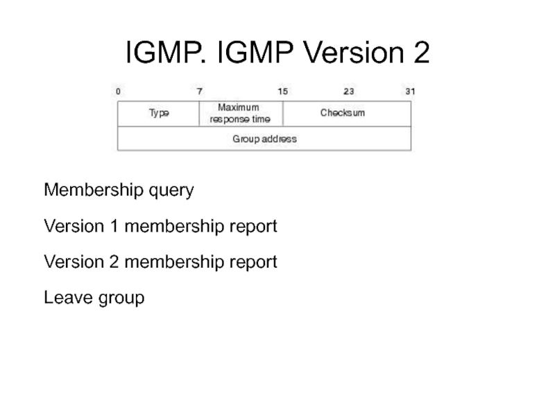 IGMP. IGMP Version 2Membership queryVersion 1 membership reportVersion 2 membership reportLeave group