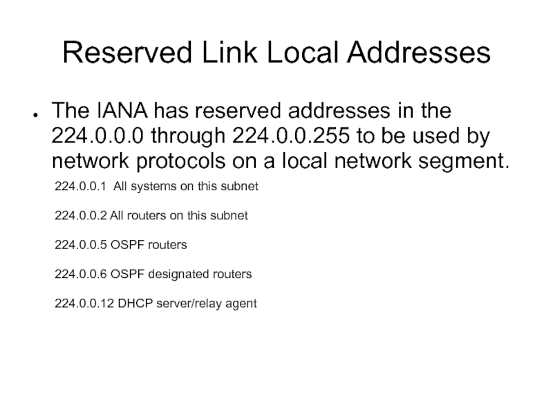 Reserved Link Local AddressesThe IANA has reserved addresses in the 224.0.0.0 through 224.0.0.255 to be used by