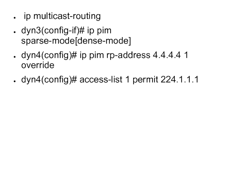 ip multicast-routingdyn3(config-if)# ip pim sparse-mode[dense-mode]dyn4(config)# ip pim rp-address 4.4.4.4 1 overridedyn4(config)# access-list 1 permit 224.1.1.1