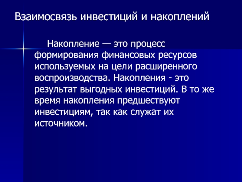 Взаимосвязь инвестиций и накоплений		    Накопление — это процесс формирования финансовых ресурсов используемых на цели