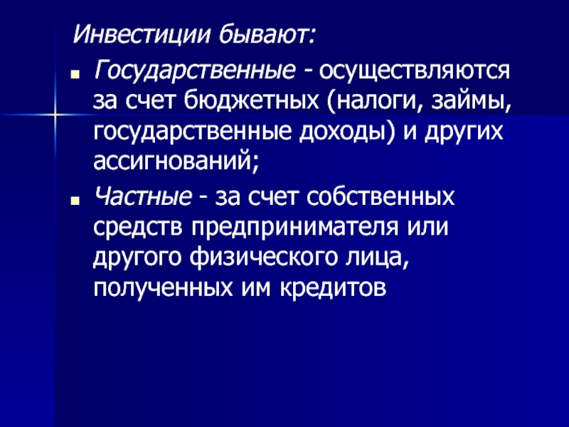 Инвестиции бывают:Государственные - осуществляются за счет бюджетных (налоги, займы, государственные доходы) и других ассигнований;Частные - за счет