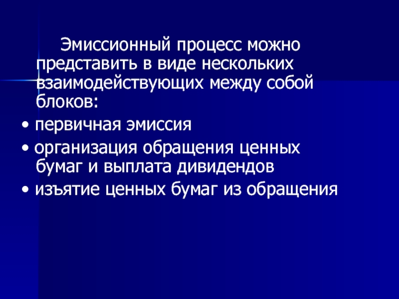 Эмиссионный процесс можно представить в виде нескольких взаимодействующих между собой блоков:• первичная эмиссия• организация обращения ценных бумаг