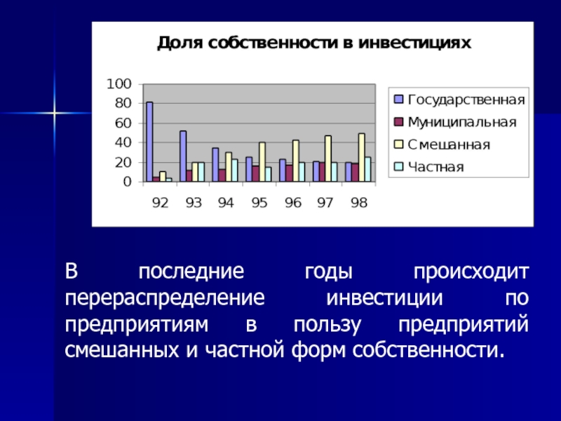 В последние годы происходит перераспределение инвестиции по предприятиям в пользу предприятий смешанных и частной форм собственности.