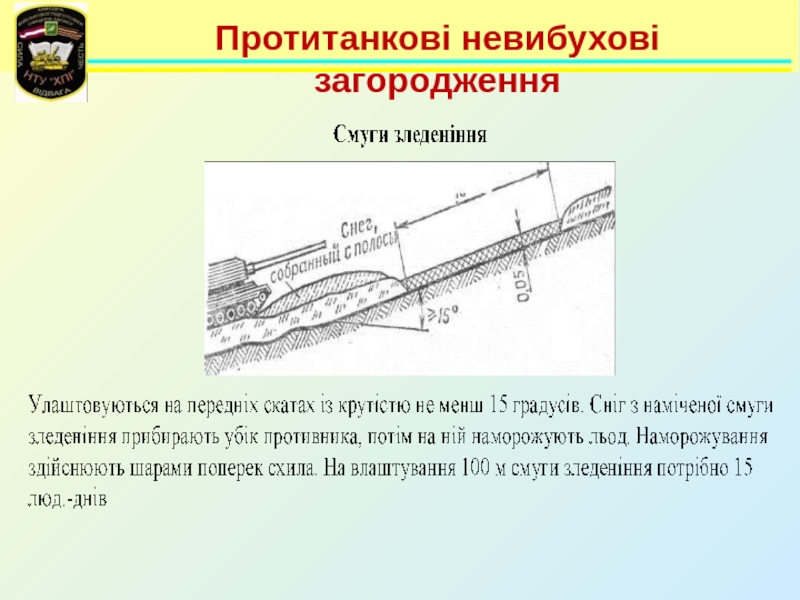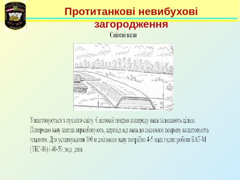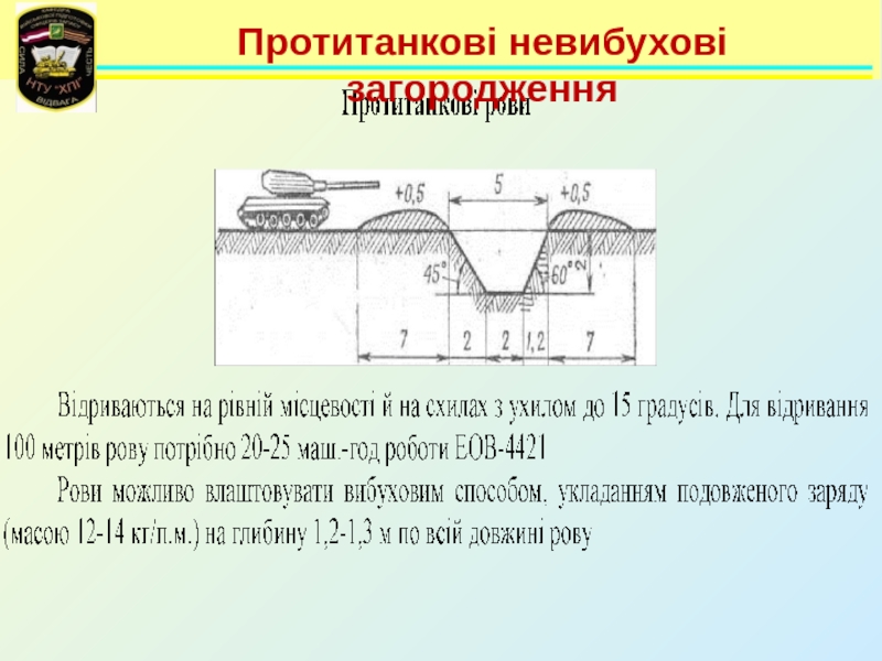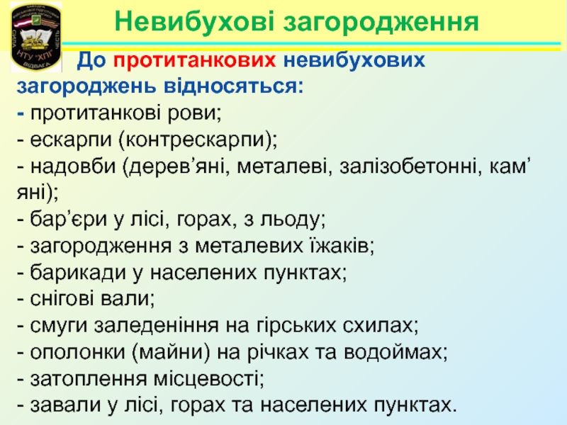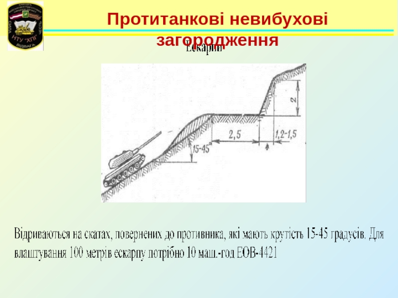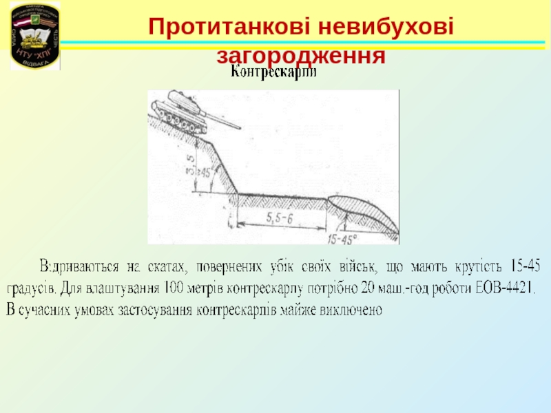 Невибухові загородження      До протитанкових невибухових загороджень відносяться:- протитанкові рови;- ескарпи (контрескарпи);- надовби