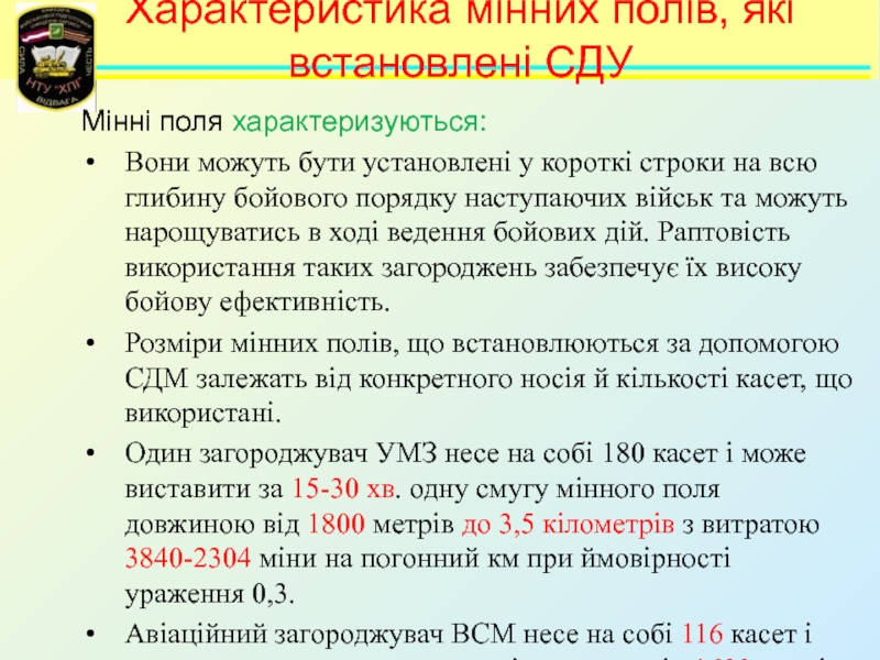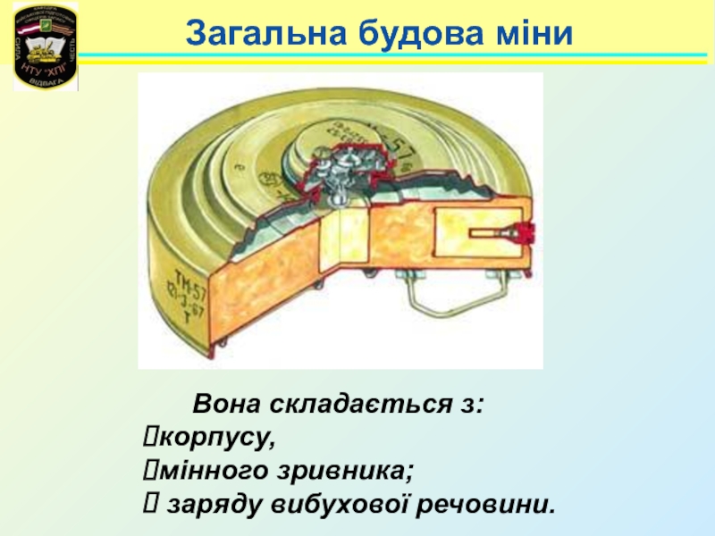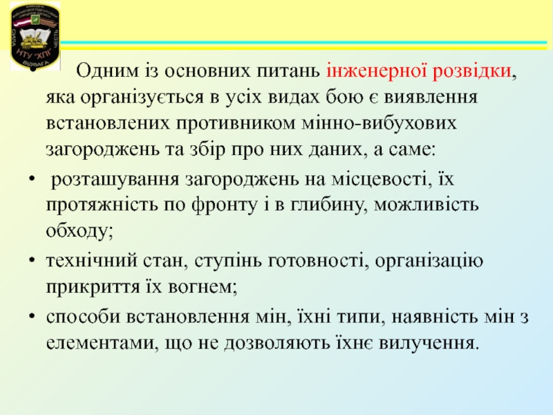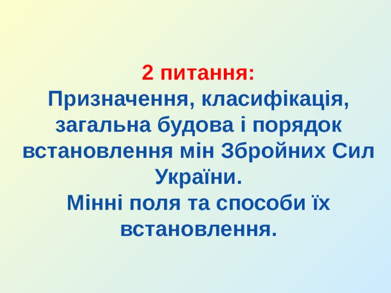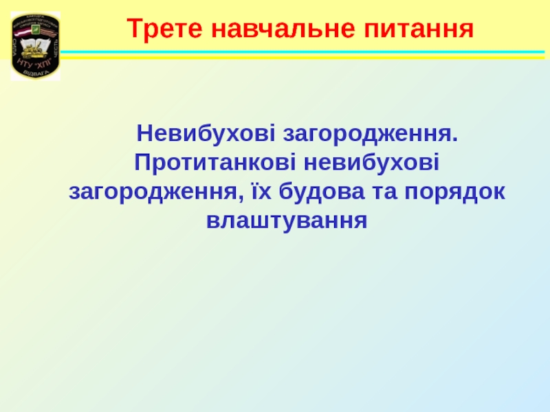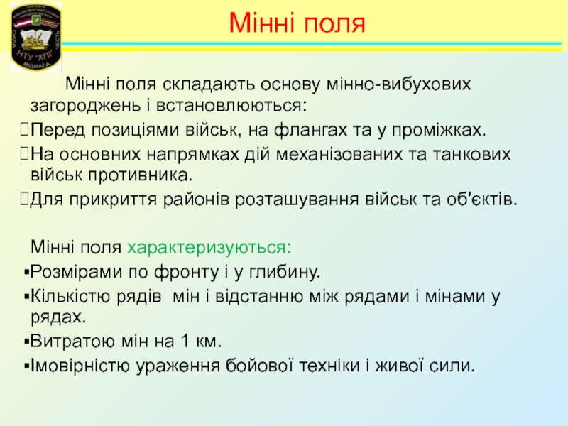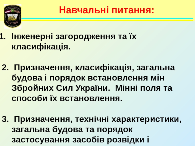 Навчальні питання:Інженерні загородження та їх класифікація. 2. Призначення, класифікація, загальна будова і порядок встановлення мін Збройних Сил України. Мінні поля та способи їх встановлення. 3. Призначення, технічні характеристики, загальна будова та