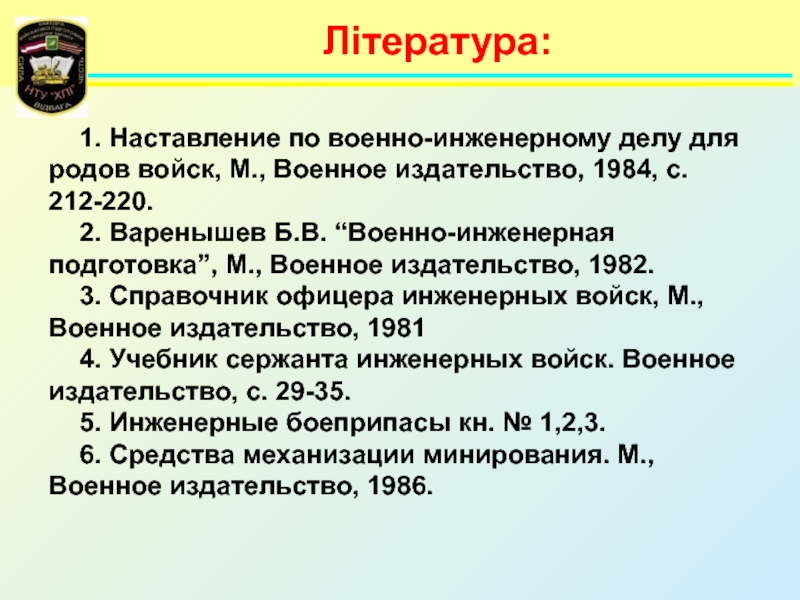 Література:1. Наставление по военно-инженерному делу для родов войск, М., Военное издательство, 1984, с. 212-220. 2. Варенышев Б.В.