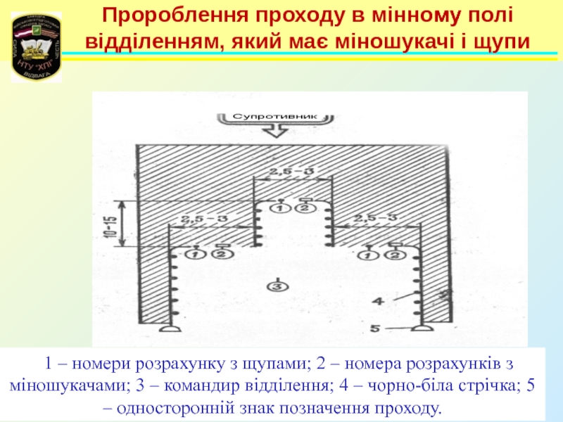 розрахунків з міношукачами; 3 – командир відділення; 4 – чорно-біла стрічка; 5 – односторонній знак позначення проходу.