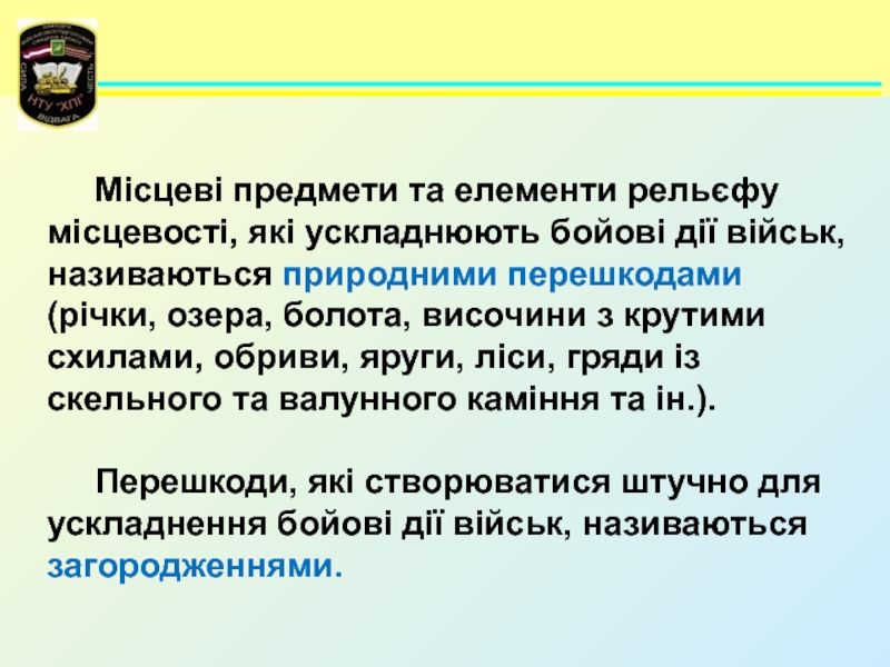 Місцеві предмети та елементи рельєфу місцевості, які ускладнюють бойові дії військ, називаються природними перешкодами