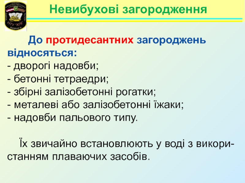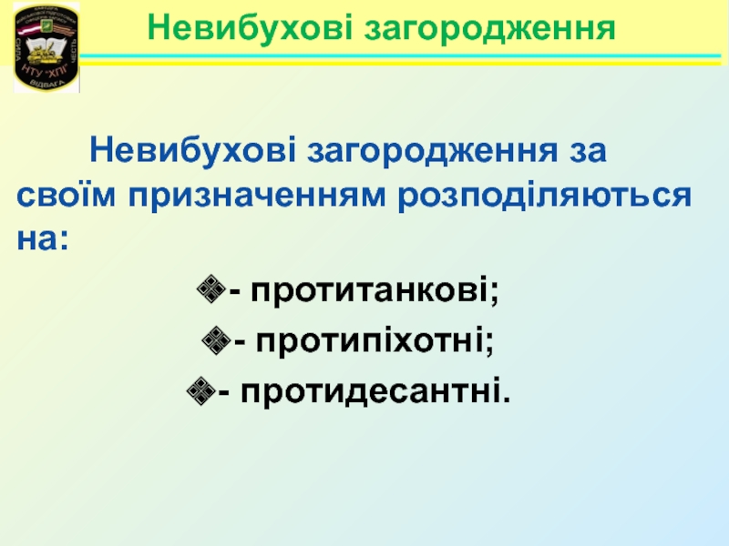 Невибухові загородження    Невибухові загородження за своїм призначенням розподіляються на:- протитанкові;- протипіхотні;- протидесантні.