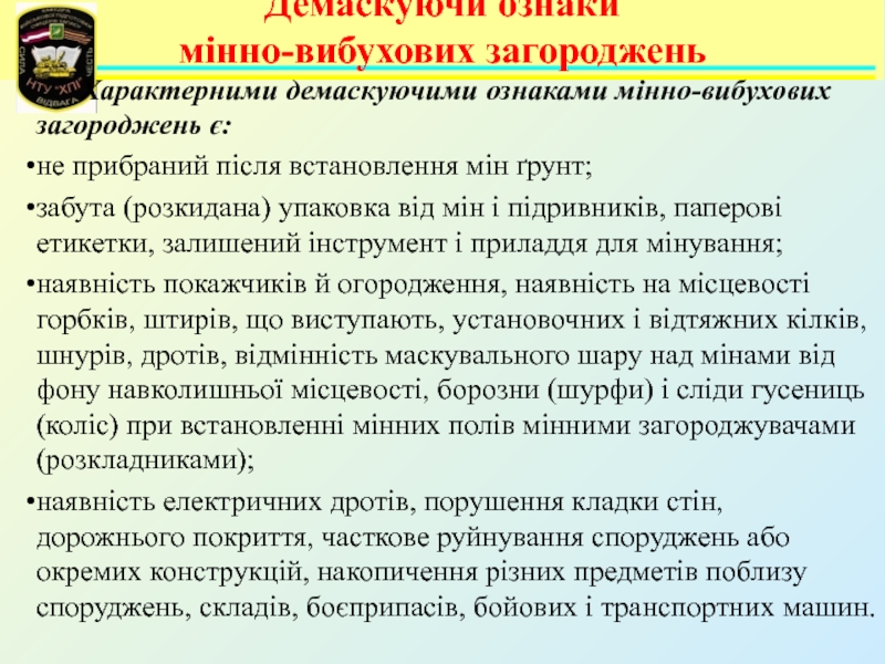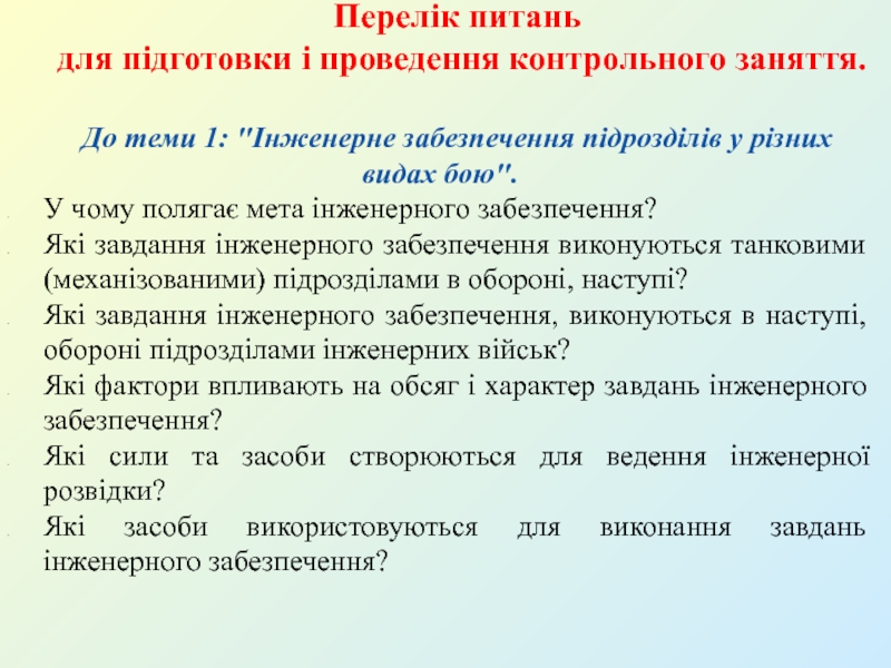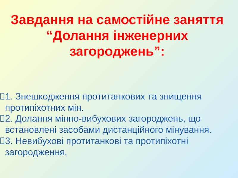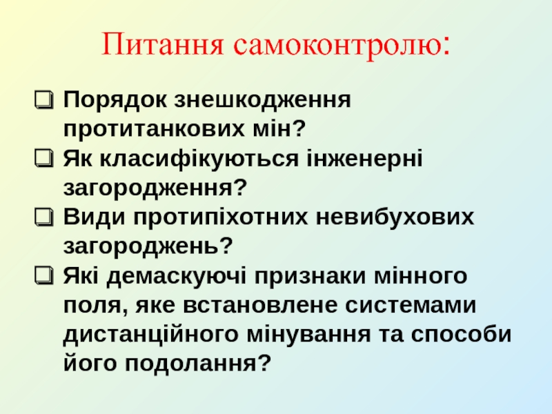 Питання самоконтролю:Порядок знешкодження протитанкових мін?Як класифікуються інженерні загородження?Види протипіхотних невибухових загороджень?Які демаскуючі признаки мінного поля, яке встановлене