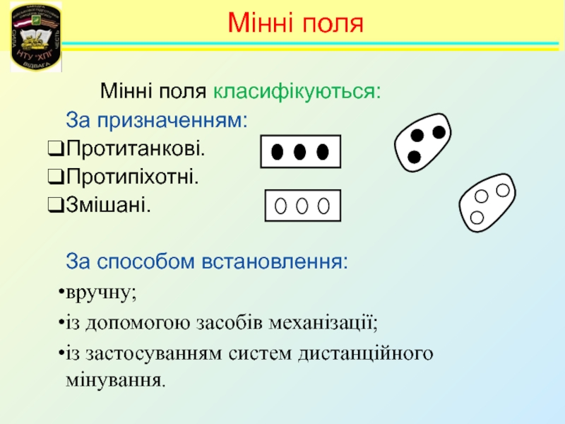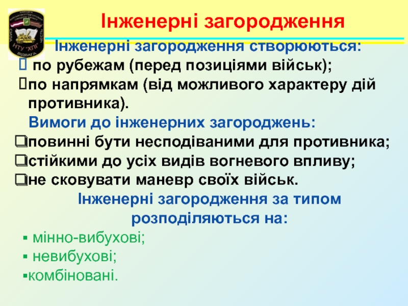 Навчальні питання:Інженерні загородження та їх класифікація. 2. Призначення, класифікація, загальна будова і порядок встановлення мін Збройних Сил