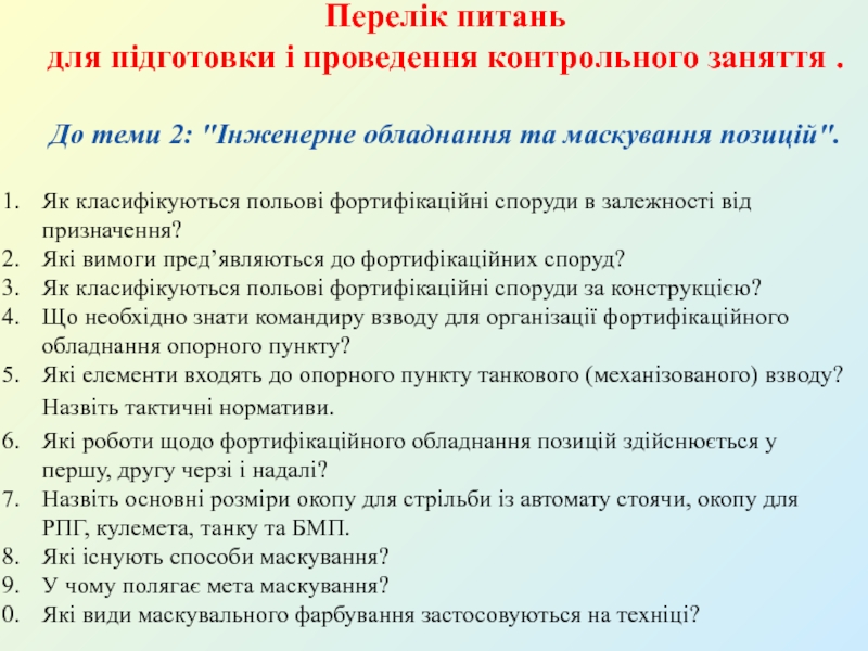Перелік питаньдля підготовки і проведення контрольного заняття.   До теми 4: ʺІнженерні загородження, їх улаштування та подоланняʺЩо таке