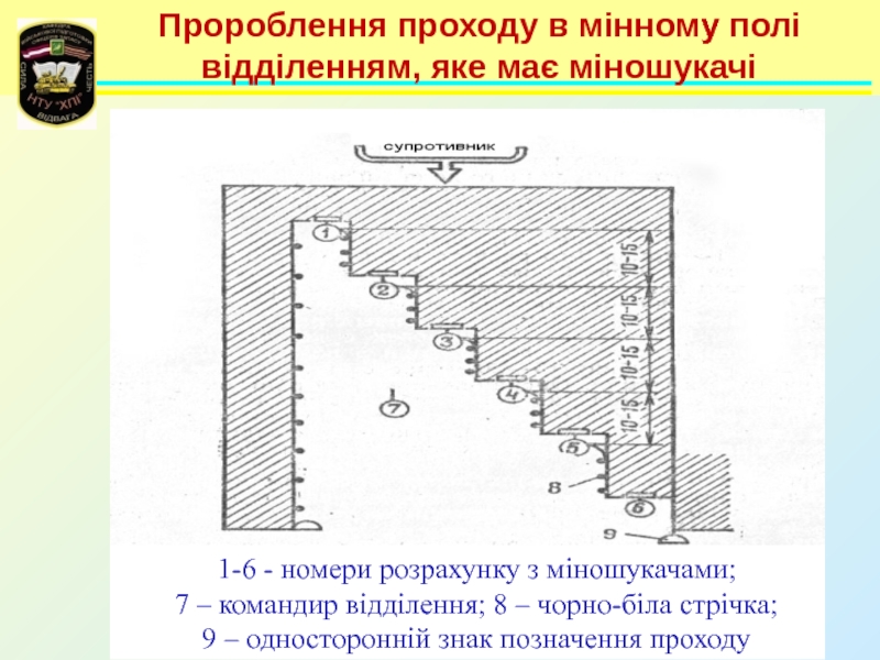 Слайд 77Пророблення проходу в мінному полі відділенням, яке має міношукачі