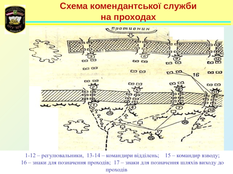 Схема комендантської служби на проходах1-12 – регулювальники, 13-14 – командири відділень;  15 – командир взводу; 16