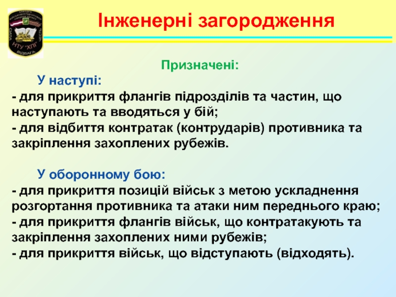 Інженерні загородженняПризначені:    У наступі:- для прикриття флангів підрозділів та частин, що наступають та вводяться