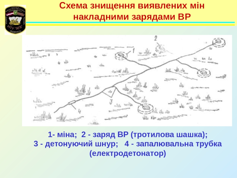 Слайд 76Схема знищення виявлених мін накладними зарядами ВР
