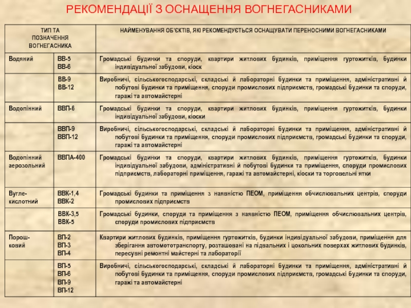Слайд 74РЕКОМЕНДАЦІЇ З ОСНАЩЕННЯ ВОГНЕГАСНИКАМИ