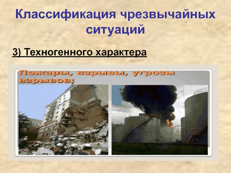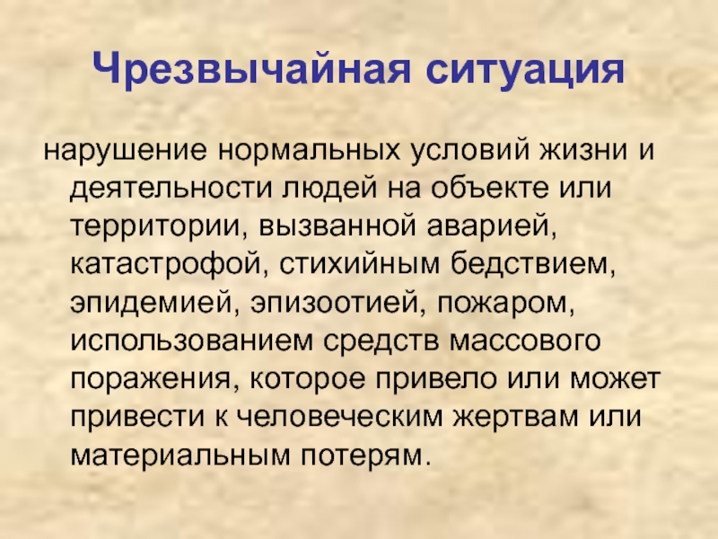 образованием очагов пожаров, радиоактивными, химическим или биологическим заражением местности, которые привели или могут привести к значительным материальным утратам и поражения или смерти людей.