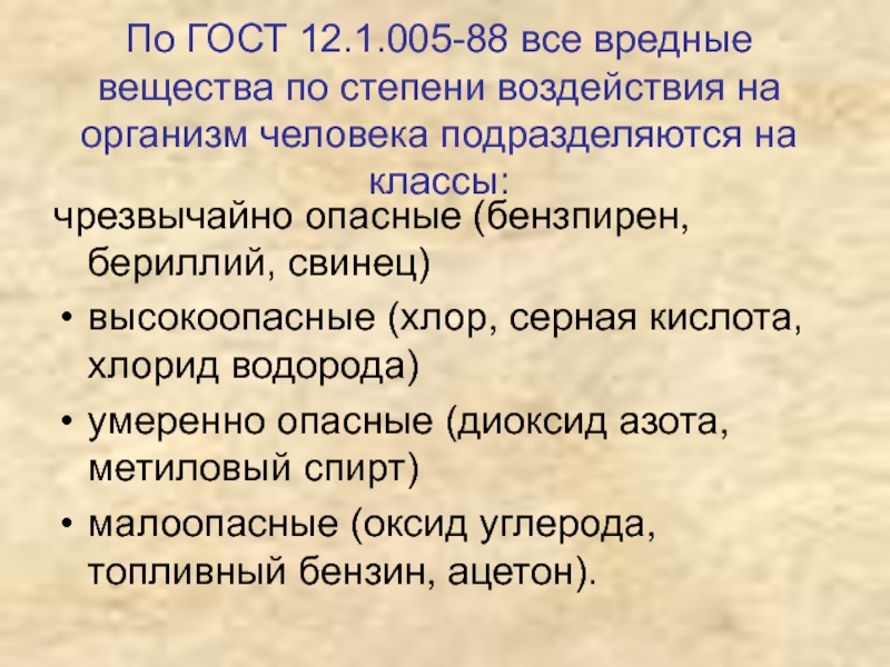 Слайд 86По ГОСТ 12.1.005-88 все вредные вещества по степени воздействия на