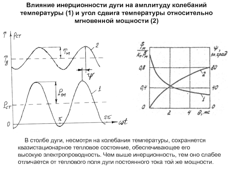 Слайд 4Влияние инерционности дуги на амплитуду колебаний температуры (1) и угол