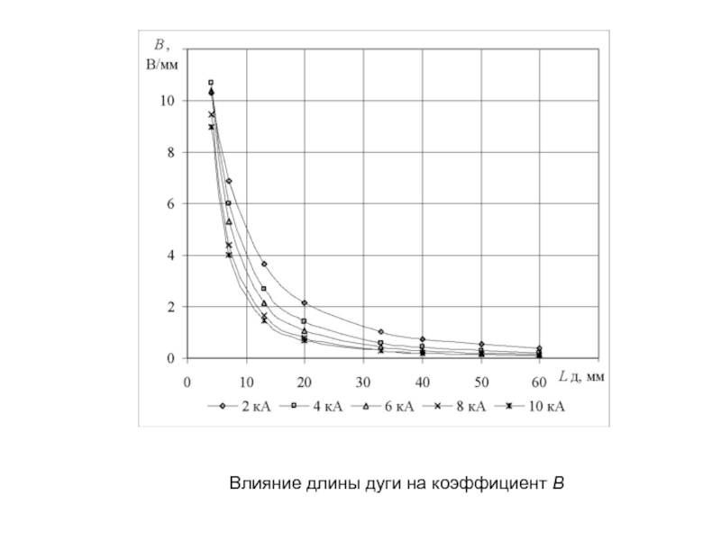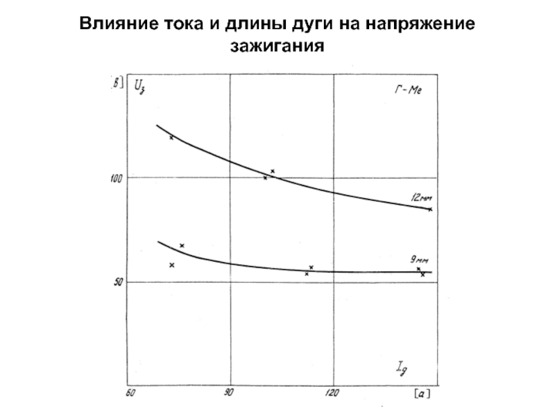 Слайд 7Влияние тока и длины дуги на напряжение зажигания