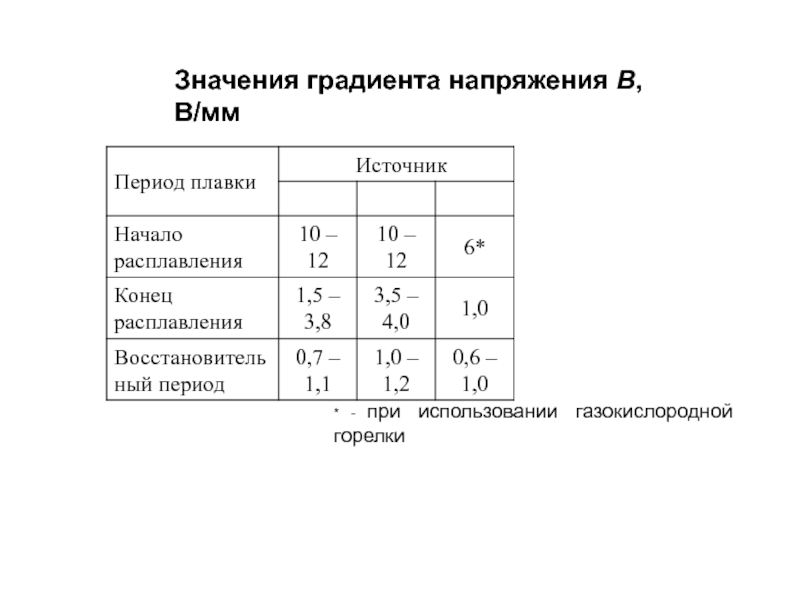 Значения градиента напряжения В, В/мм * - при использовании газокислородной горелки