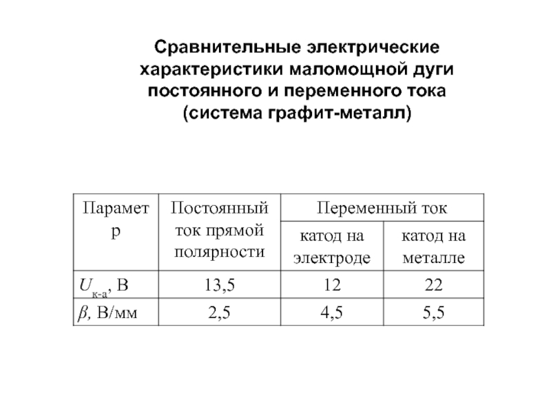 Слайд 14Сравнительные электрические характеристики маломощной дуги постоянного и переменного тока