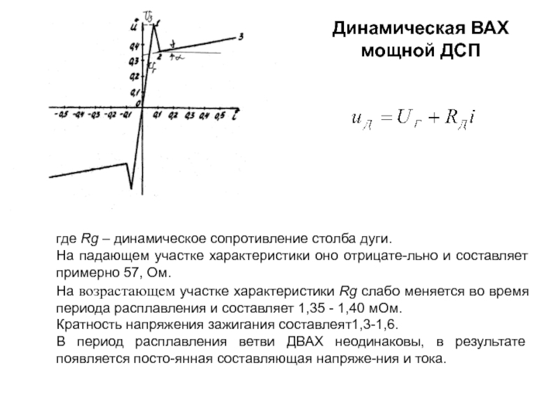 Динамическая ВАХ  мощной ДСПгде Rg – динамическое сопротивление столба дуги. На падающем участке характеристики оно отрицате-льно