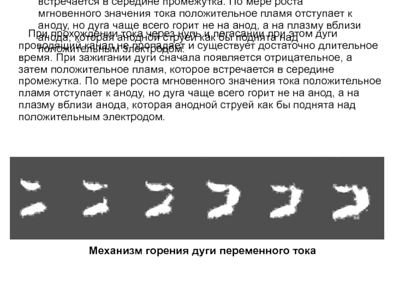 При прохождении тока через нуль и погасании при этом дуги проводящий канал не пропадает и существует достаточно длительное время. При зажигании дуги сначала появляется отрицательное, а затем положительное пламя, которое встречается в середине промежутка. По мере роста мгновенного значения тока положительное пламя отступает к аноду, но дуга чаще всего горит не на анод, а на плазму вблизи анода, которая анодной струей как бы поднята над положительным электродом.