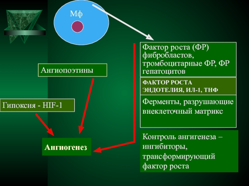 АнгиогенезГипоксия - HIF-1МфФАКТОР РОСТА ЭНДОТЕЛИЯ, ИЛ-1, ТНФФактор роста (ФР) фибробластов, тромбоцитарные ФР, ФР гепатоцитовФерменты, разрушающие внеклеточный матриксКонтроль