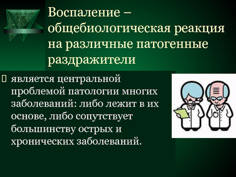 Воспаление –общебиологическая реакция на различные патогенные раздражители является центральной проблемой патологии многих заболеваний: либо лежит в их