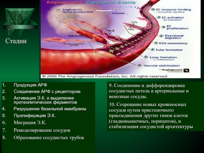 Продукция АРФСоединение АРФ с рецепторомАктивация Э.К. и выделение протеолитических ферментовРазрушение базальной мембраныПролиферация Э.К.Миграция Э.К. Ремоделирование сосудовОбразование сосудистых