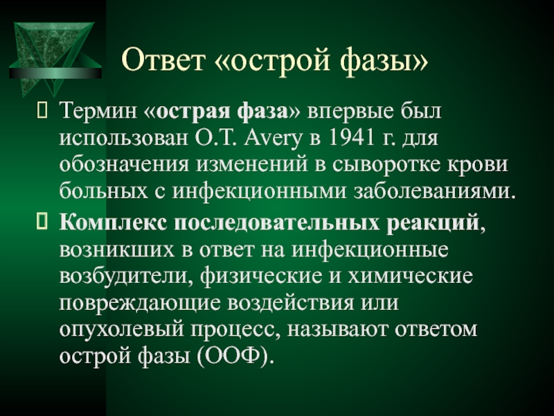 Ответ «острой фазы»Термин «острая фаза» впервые был использован О.Т. Avery в 1941 г. для обозначения изменений в