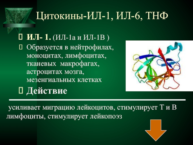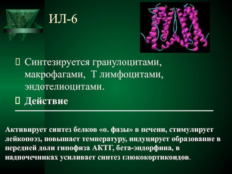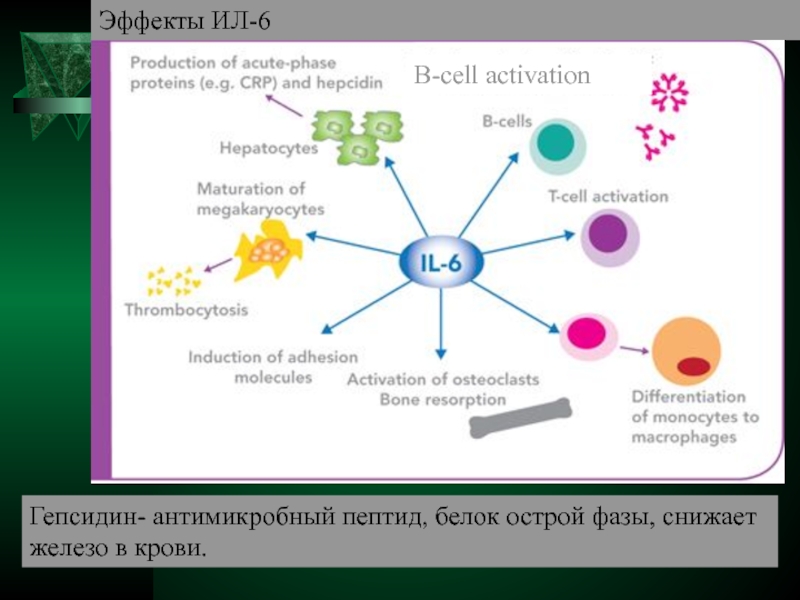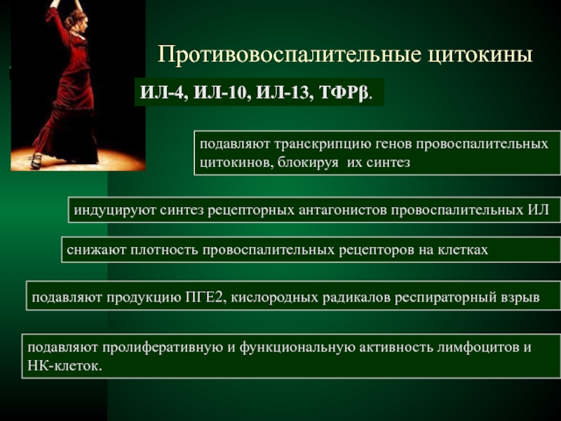 Противовоспалительные цитокины ИЛ-4, ИЛ-10, ИЛ-13, ТФРβ. подавляют транскрипцию генов провоспалительных цитокинов, блокируя их синтезиндуцируют синтез рецепторных антагонистов