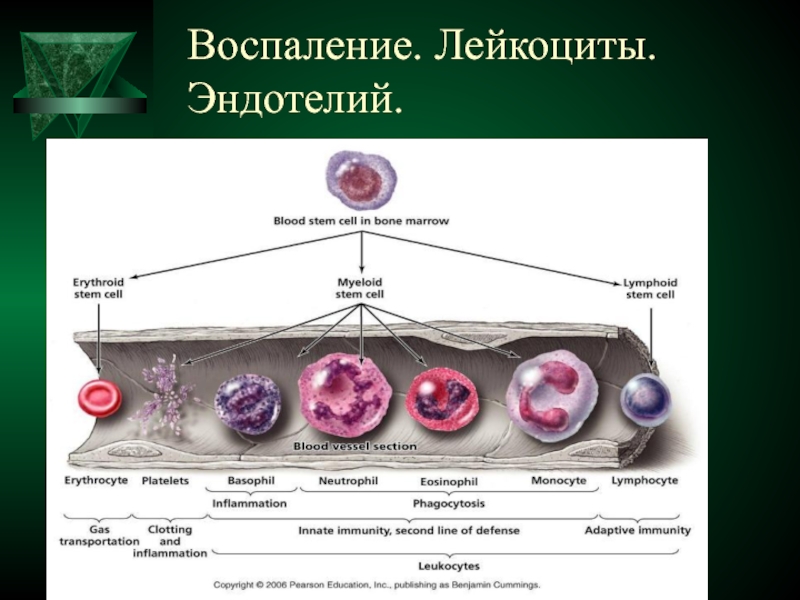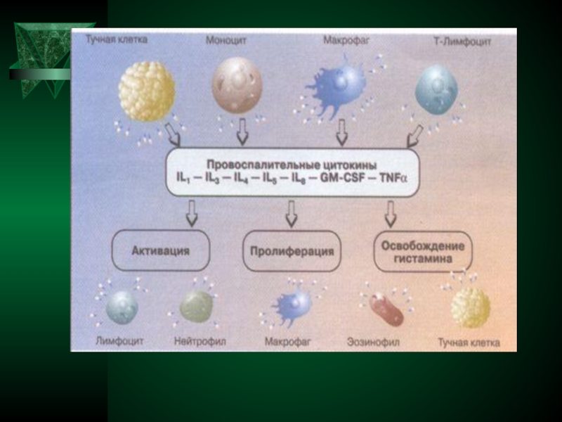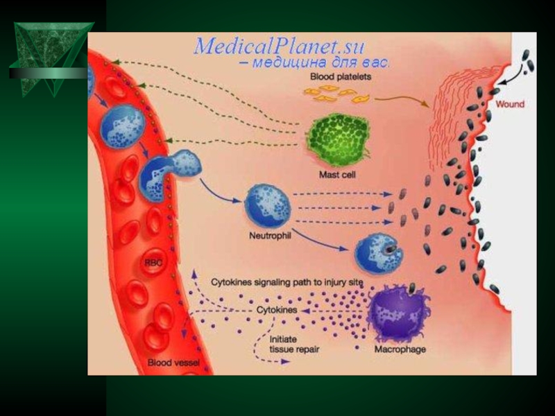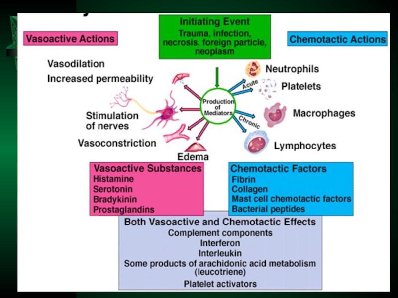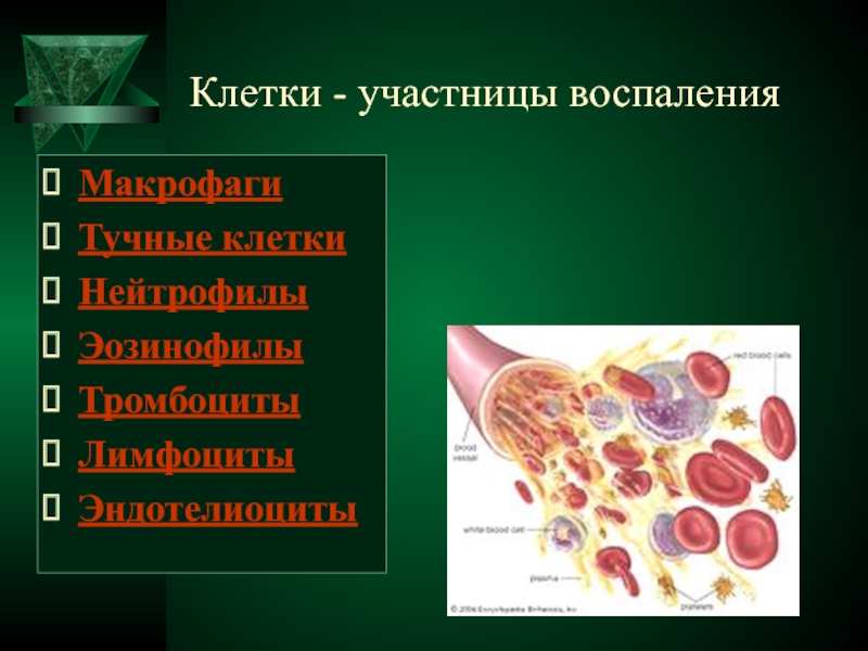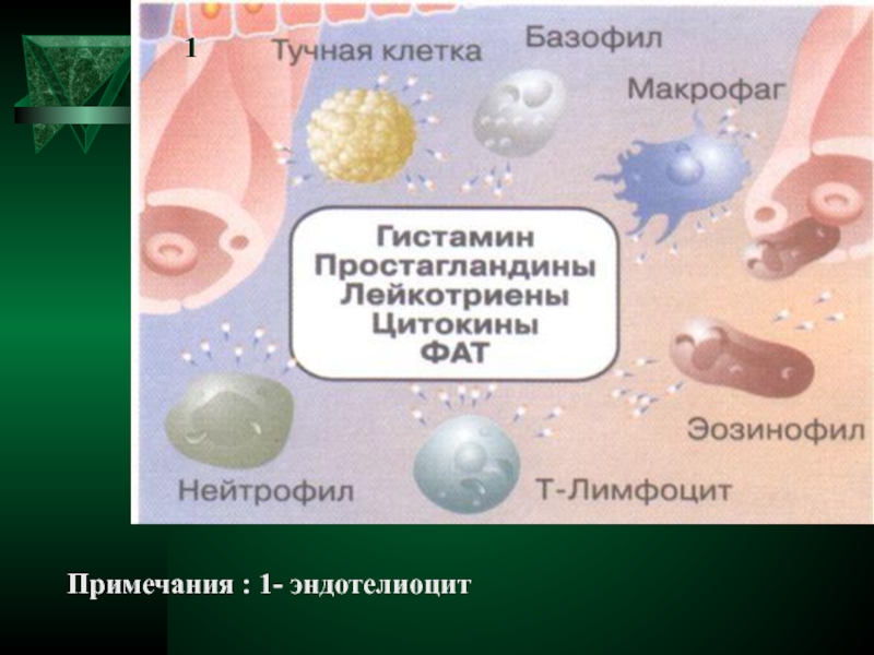 Клетки - участницы воспаленияМакрофаги Тучные клетки Нейтрофилы Эозинофилы Тромбоциты ЛимфоцитыЭндотелиоциты