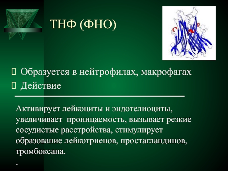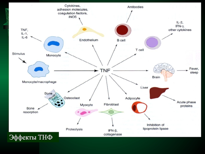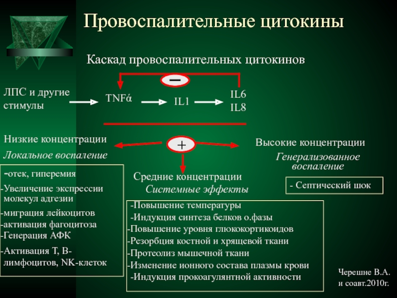 Провоспалительные цитокины Каскад провоспалительных цитокиновЛПС и другие стимулыTNFάIL1IL6IL8+Низкие концентрацииСредние концентрацииВысокие концентрацииГенерализованное воспалениеСистемные эффекты- Септический шок-Повышение температуры-Индукция синтеза