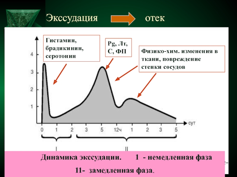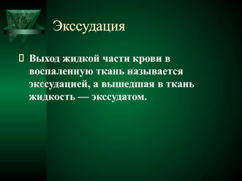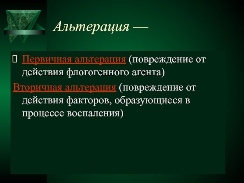 Альтерация —Первичная альтерация (повреждение от действия флогогенного агента)Вторичная альтерация (повреждение от действия факторов, образующиеся в процессе воспаления)