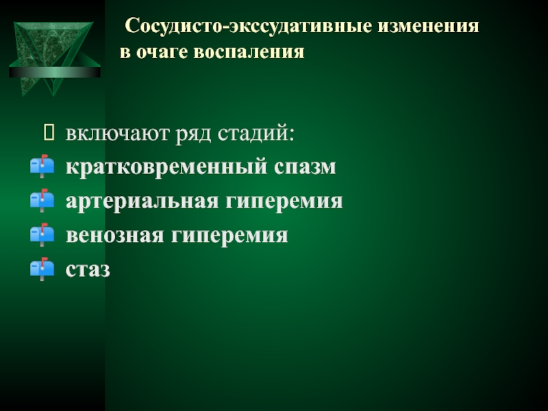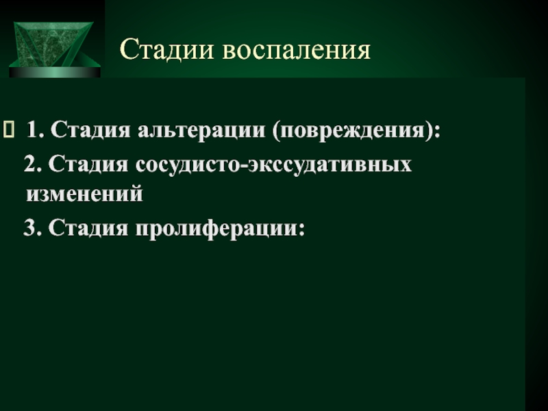 Стадии воспаления1. Стадия альтерации (повреждения):  2. Стадия сосудисто-экссудативных изменений  3. Стадия пролиферации: