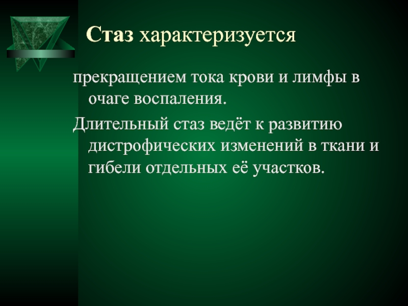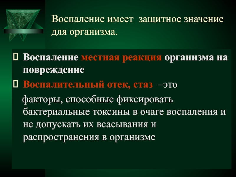 Воспаление имеет защитное значение для организма.Воспаление местная реакция организма на повреждение Воспалительный отек, стаз –это