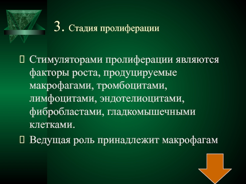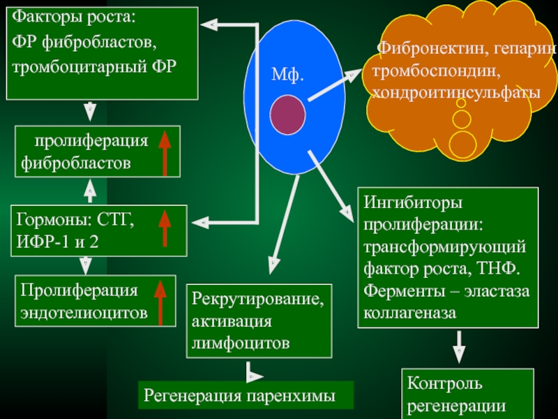 Мф.Факторы роста:ФР фибробластов,тромбоцитарный ФР  пролиферация     фибробластовГормоны: СТГ, ИФР-1 и 2Пролиферация эндотелиоцитовКонтроль регенерации