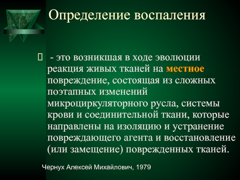 Определение воспаления - это возникшая в ходе эволюции реакция живых тканей на местное повреждение, состоящая из сложных