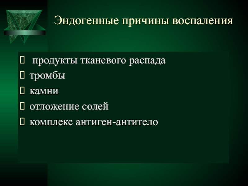 Эндогенные причины воспаления продукты тканевого распадатромбыкамниотложение солейкомплекс антиген-антитело