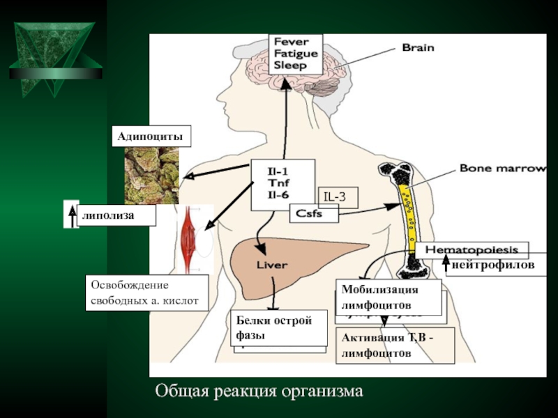 нейтрофиловАктивация Т,В - лимфоцитовОсвобождение свободных а. кислотБелки острой фазыМобилизация лимфоцитовIL-3АдипоцитылиполизаОбщая реакция организма
