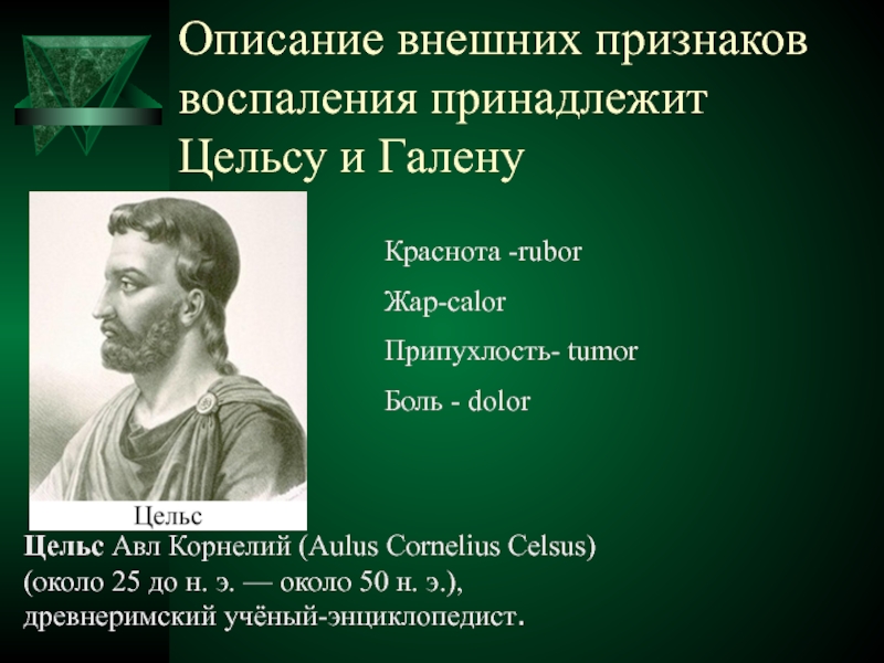 Описание внешних признаков воспаления принадлежит Цельсу и Галену Цельс Авл Корнелий (Aulus Cornelius Celsus) (около 25 до