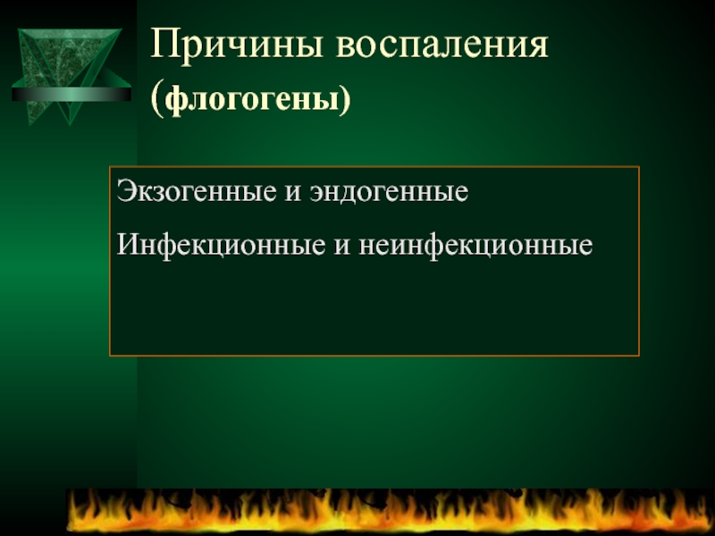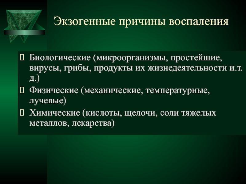 Экзогенные причины воспаленияБиологические (микроорганизмы, простейшие, вирусы, грибы, продукты их жизнедеятельности и.т.д.)Физические (механические, температурные, лучевые)Химические (кислоты, щелочи, соли