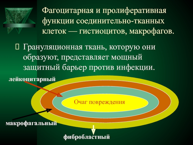 Фагоцитарная и пролиферативная функции соединительно-тканных клеток — гистиоцитов, макрофагов. Грануляционная ткань, которую они образуют, представляет мощный защитный