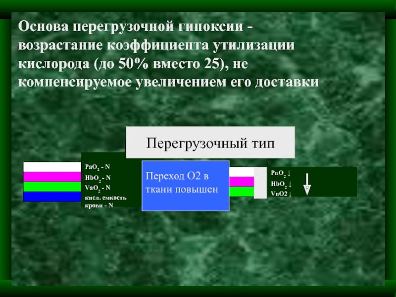 Слайд 14Основа перегрузочной гипоксии - возрастание коэффициента утилизации кислорода (до 50%